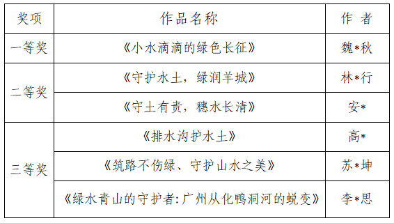 按照《关于开展2025年广州市水土保持短视频征集活动的通知》安排,我局已完成相关作品评审工作。现将获奖作品名单公示如下: