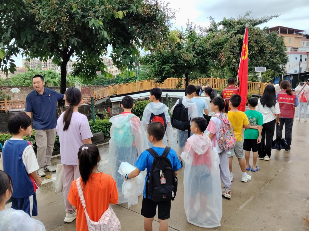 尽管细雨绵绵,青少年们身着印有"红色护河先锋"字样的统一雨衣,以"风雨无阻护河行"的坚定信念整装出发。队伍从凤溪社区党群服务中心启程,沿途经过牛肚湾涌治污示范段,最终抵达具有光荣革命传统的凤溪革命老区。在革命烈士纪念碑前,老党员为同学们讲述了抗战时期凤溪人民保护水源地、支援游击队的感人故事,将红色精神与水资源保护的历史渊源娓娓道来。